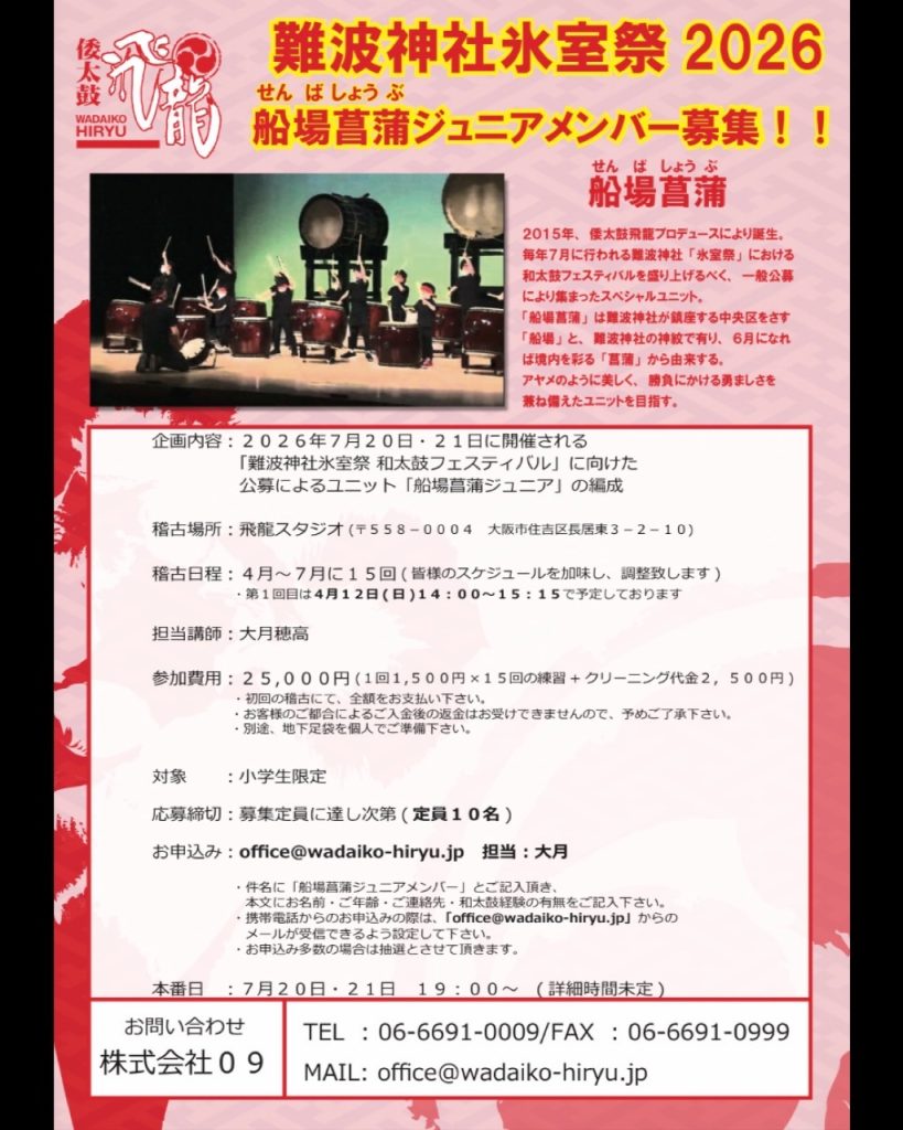 難波神社氷室祭和太鼓フェスティバル、船場菖蒲・船場菖蒲Jr.募集!!